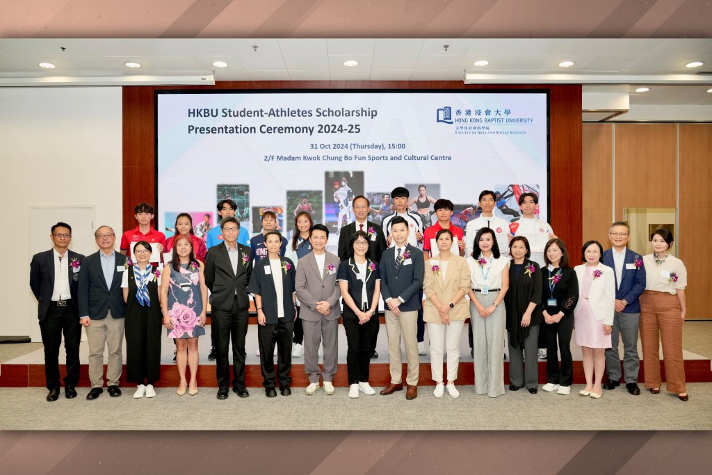 浸大校长卫炳江在昨日举行的奖学金颁授礼上,向9名学生运动员颁发证书,运动员则向他赠送一份巴黎奥运会的特别纪念品。 去年通过优才运动员入学计划入读浸大的排球运动员江卓轩及剑击运动员梁洛文,亦向新一届学生运动员建议如何适应大学生活,以及平衡训练与学业。