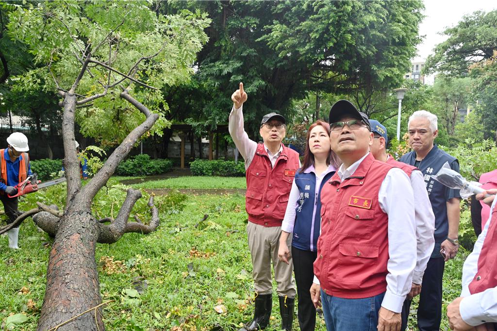 ▲侯友宜于上午10时40分前往“板桥国光公园”以及环河公园视察路树倾倒复原情形。