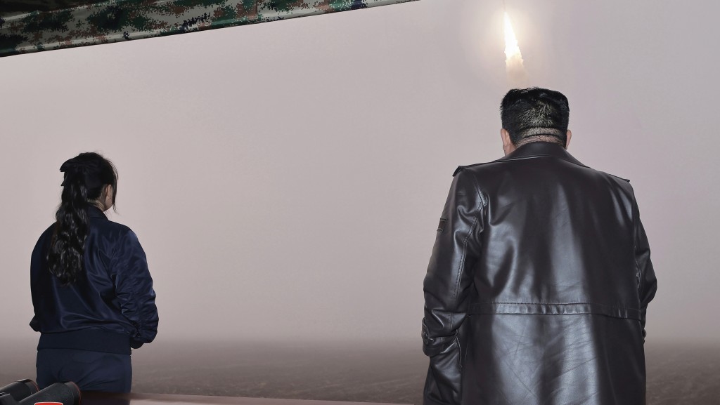 ▲朝鲜领导人金正恩(右)与女儿视察火星-19洲际弹道导弹发射。 美联社