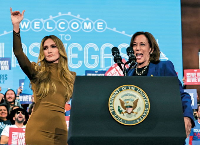 ▲好莱坞女星珍妮花洛庇丝(左)周四在赌城拉斯维加斯的造势会上,为哈里斯站台。
