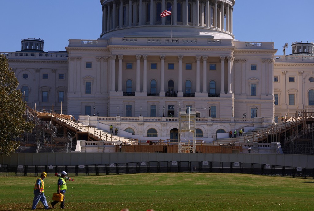 白宫前的拉法叶公园(Lafayette Park)有一道安全围篱将园区一分为二,围篱后方堆满路障。建筑工人正在搭建讲台,作为就职典礼庆祝活动的一部份。