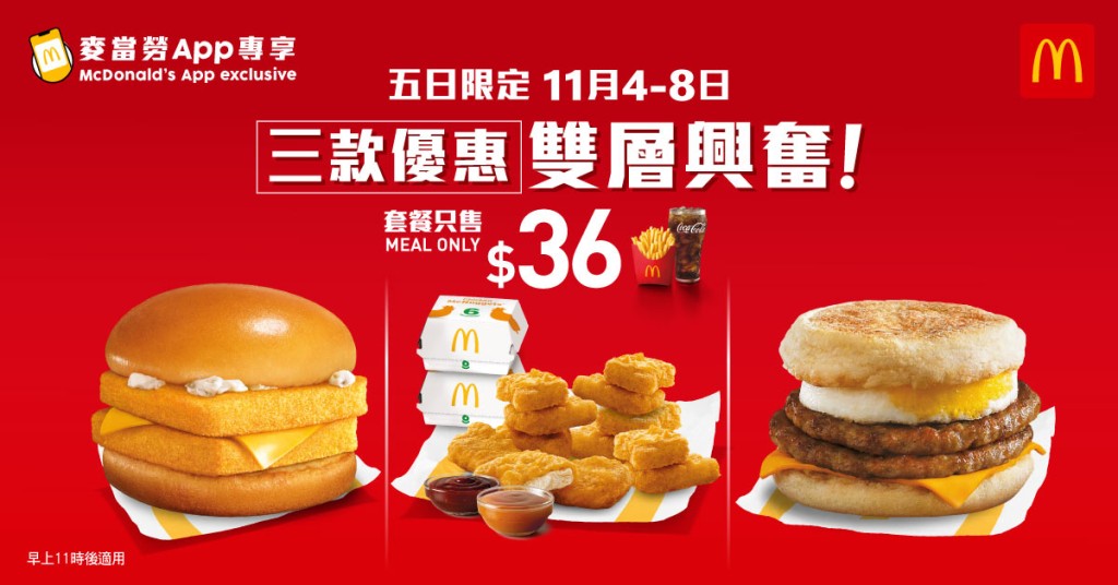 ▲麦当劳优惠︳三款$36超值套餐强势回归! 快闪五日 双层鱼柳饱/双层猪柳蛋汉堡/12件麦乐鸡 内文附优惠详情