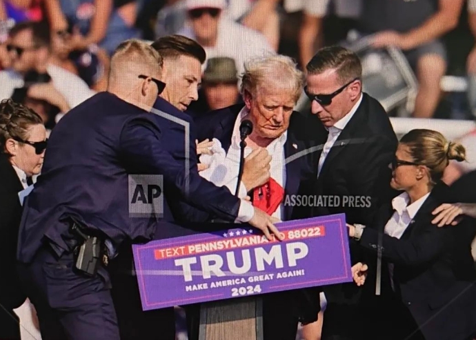 ▲今年7月,特朗普在美国宾夕法尼亚州巴特勒市举行的集会上遭“未遂刺杀”,右耳受伤。