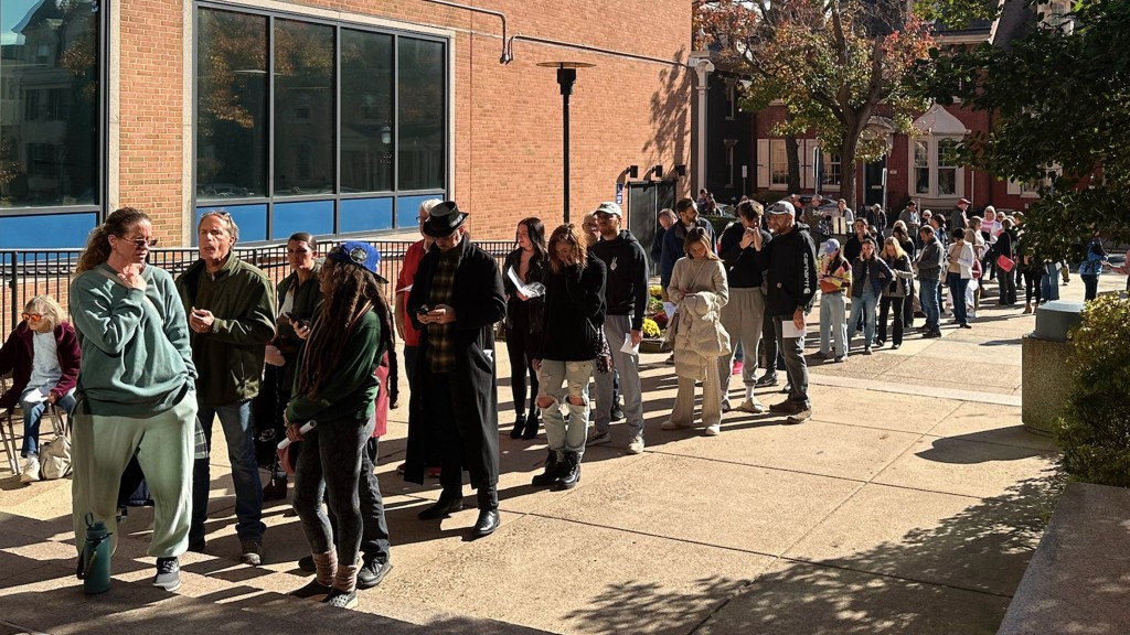 ▲2024年10月29日,宾州多伊尔斯敦居民大排长龙,在最后一天申请按需邮寄选票。 美联社