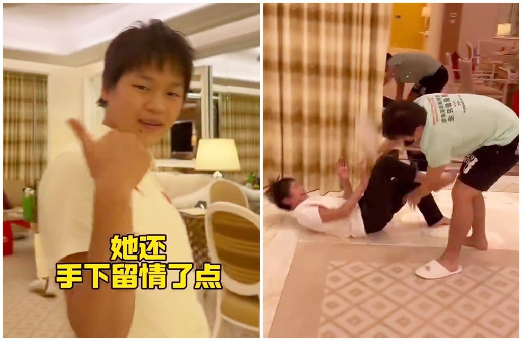 但说时迟那时快,全红婵突然朝王宗源左脸颊呼了一巴掌,王宗源发现上当被整后,立刻追著全红婵要“报仇”。只见他手持拖鞋朝倒在地上的全红婵“狂打屁股”,全红婵也立刻跟拍摄者“谢哥”谢思埸求救。影片结束前,她展现私下搞怪一面,立刻把走道当成伸展台在走,最后对著镜头摆出讚的手势,逗得在场所有人哄堂大笑。
