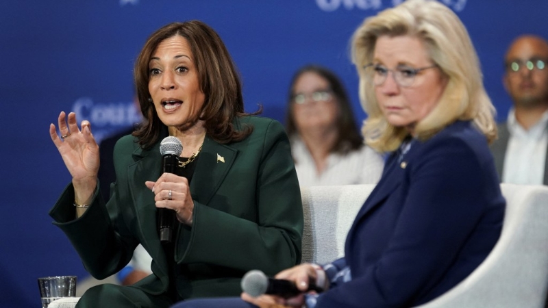 ▲哈里斯(左)获共和党前众议员利兹切尼倒戈站台。 路透社