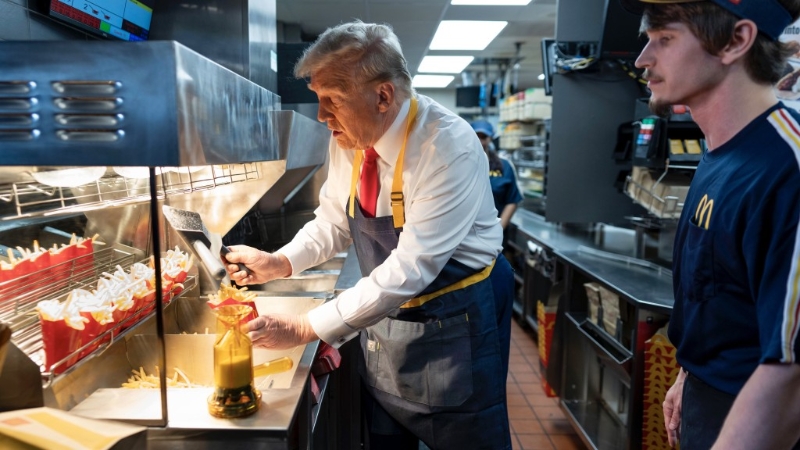 ▲特朗普日前“扮工”拉票亲自炸薯条。 美联社