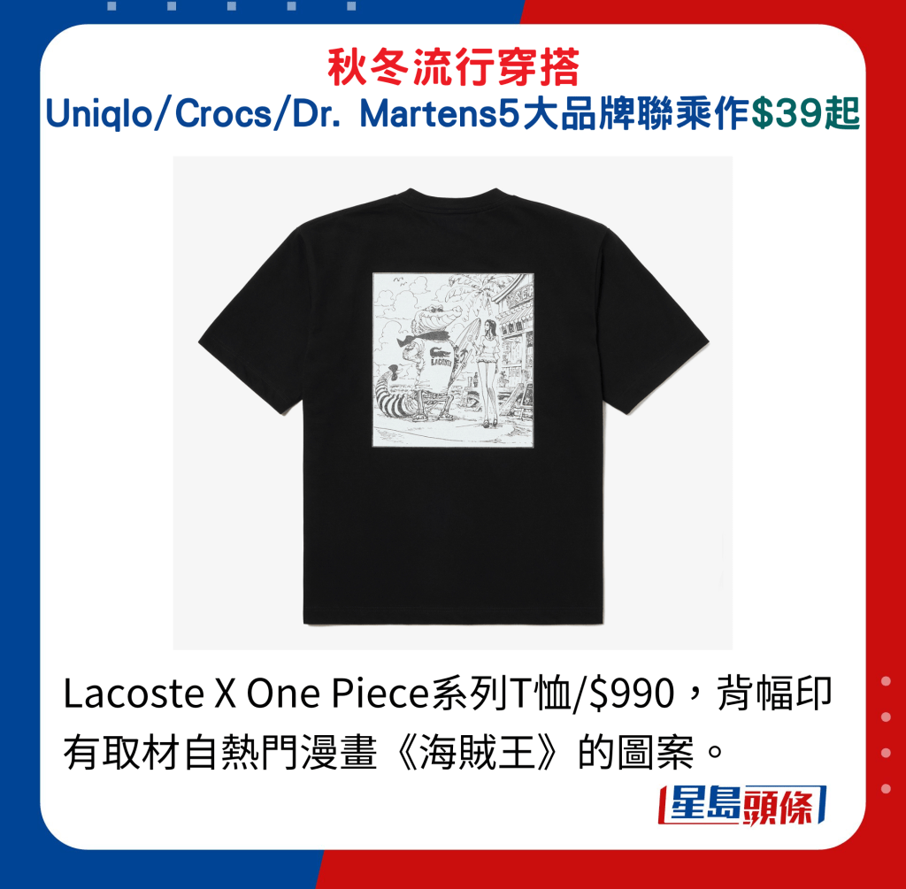 部分品牌联乘人气动漫或热播电视剧集推出新作,满足一众“粉丝”。Dr. Martens × Wednesday系列灵感来自Netflix热门剧集《Wednesday》中的女主角Wednesday Addams,新作包括高跟Loafers 及Jadon厚底靴子等,都以其造型的标志性午夜黑色为主调设计,部分饰以光泽条纹及铆钉装饰,展现暗黑学院风。Lacoste× One Piece系列则取材自日本流行动漫《海贼王》第1106话的封面,以黑及白色为主调,招牌鳄鱼标志亦换上全新面貌,其中黑及白色T恤背幅饰以艺术印花,格外吸睛。