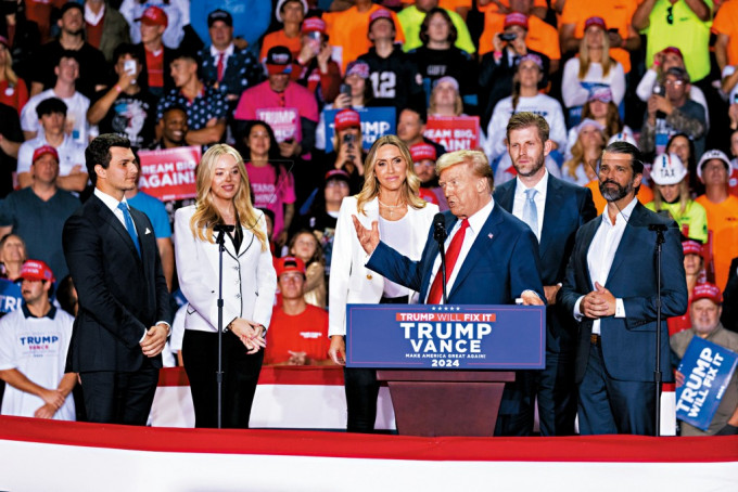 ▲特朗普周二到密歇根州大急流城造势,儿子和女儿、女婿等出动站台。