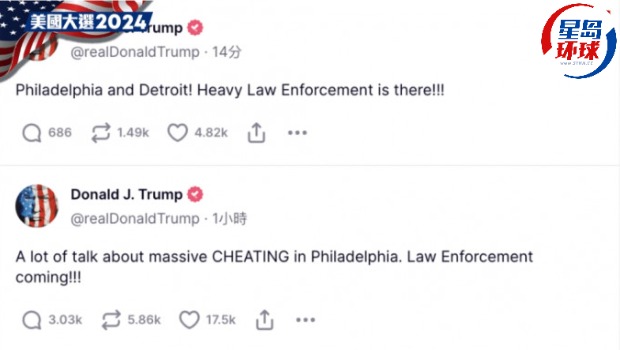 特朗普在其拥有的社交平台Truth Social 账号,发文指“很多人在谈论费城存在大规模作弊,执法部门即将到来。(A lot of talk about massive CHEATING in Philadelphia. Law Enforcement coming!!!)”。此帖文在短时间内,已获逾1万5千人点赞,及吸引2千多人留言。其后他再发文称,“费城和底特律!执法人员严密执法! !(Philadelphia and Detroit! Heavy Law Enforcement is there!!!”