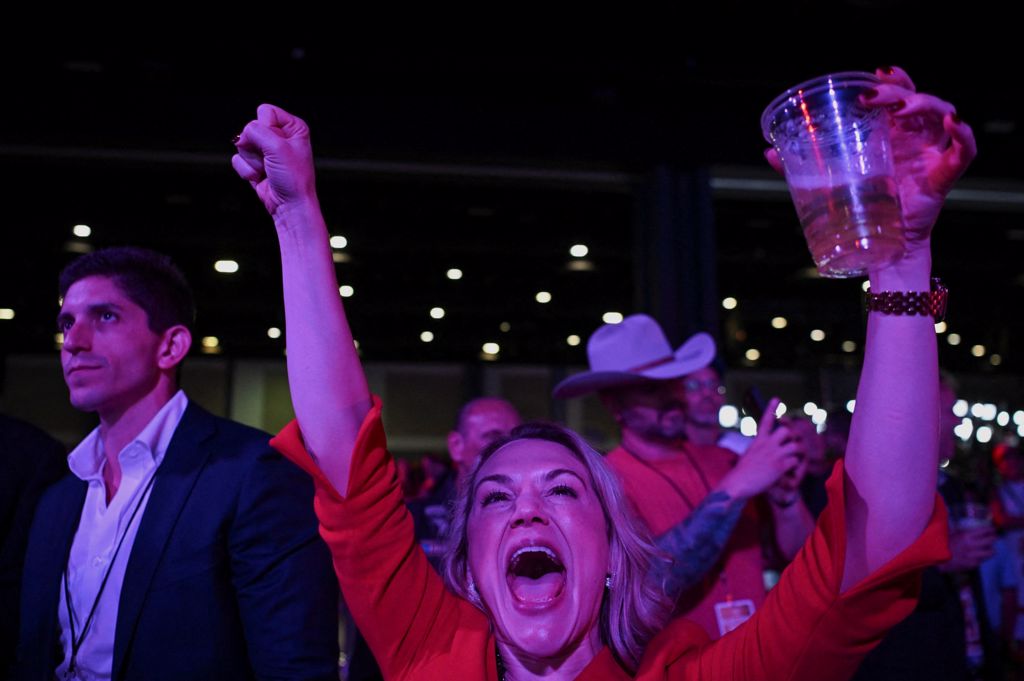 ▲美国共和党总统候选人特朗普5日在佛州西棕榈滩举行观选夜派对,参加者得知他领先后,兴奋地大声欢呼。(路透)