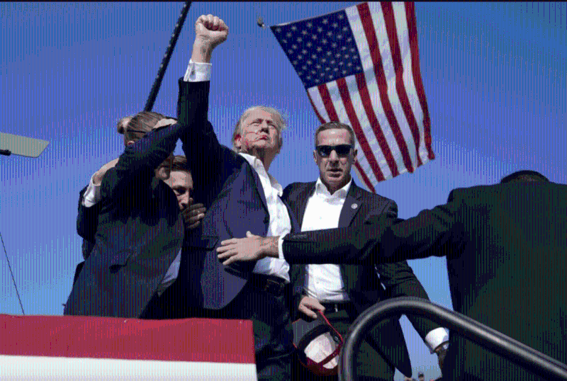 ▲这张特朗普遇刺受伤后,在国旗下振臂的照片成为经典照。美联社