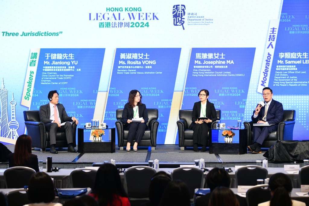 香港法律周2024︱法律周今日(7日)进入第四天活动,主题为“法治湾区 协同聚变”,下午环节展示大湾区调解,来自香港、内地及澳门三地的调解员展示如何透过调解有效解决争议,并藉模拟示范,分析和强调三地在调解方式和程序上的不同。三地调解员接着对有关示范进行讨论,并强调大湾区调解平台所取得的进展,其调解标准和《示范规则》体现了“一国两制三法域”的独特优势。
