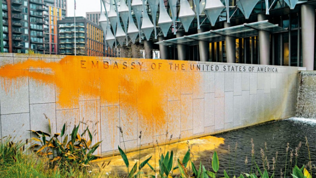 首页>美国>社会 抗议特朗普胜选,英环保分子向美使馆喷漆 发布时间:2024-11-08 08:58 英国环保人士周三向美国驻伦敦大使馆建筑物墙壁,喷洒橙色油漆,抗议美国共和党候选人特朗普在总统大选中胜出,伦敦警方逮捕了两名涉嫌刑事毁坏的男子,年龄分别25岁和72岁。环保团体“停止石油”(Just Stop Oil)在社交平台X上传的影片,可见2人在美国大使馆入口的墙上喷橙色漆。“停止石油”指出:“特朗普胜选,让平民百姓的性命处于险境,对每个地方而言都是如此。”这个环保团体曾在英国发起多场高调的抗议活动,包括向梵高的画作泼洒汤汁。 以上内容归星岛新闻集团所有,未经许可不得擅自转载引用。 专题 更多 > 中芯国际上半年营收预计超22亿美元,四季度将试产7nm工艺 太兴盈喜料多赚逾3倍,指将坚守审慎理财政策 中国移动半年多赚5%,中期息增近6% 清华女学霸创业、一年一融资,镁佳股份估值9.3亿美元冲刺港交所 应收账款走高,丰沃股份三成收入打“白条” 惠科股份IPO:获政府补助超53亿,向实控人堂弟采购超8亿 关税战|白宫:特朗普签行政命令,对华关税暂缓期再延长90日 高盛:64%关税成本由美企“买单”,消费者仅承担22% 美媒:特朗普政府通过关税施压,要求买美国军火 热门文章 特朗普当选,顾立雄急赴“总统府”开会!陈挥文爆内幕:别怕 紧追京华城弊案,北检6度提讯沈庆京及应晓薇 男艺人西门町住处“嘿咻13岁女”,餐厅打工维生月收入曝光 刘涛救“破产富商”秒复出!“1年狂接18部戏”还清13亿 江西美女乡官李佩霞案今日开庭,曾为升职献身兼受贿 习近平向美国当选总统特朗普致贺电 人生第一次能自由上网,赴俄作战一万朝鲜兵竟“沉迷色情片”? 53岁江美仪失婚8年自爆玩交友App找壮男,不抗拒“炮友” 马斯克要求SpaceX台湾供应商将生产线移至海外 ArtCan艺文聚焦 | 香港博物馆节2024,博古缤纷文化传承