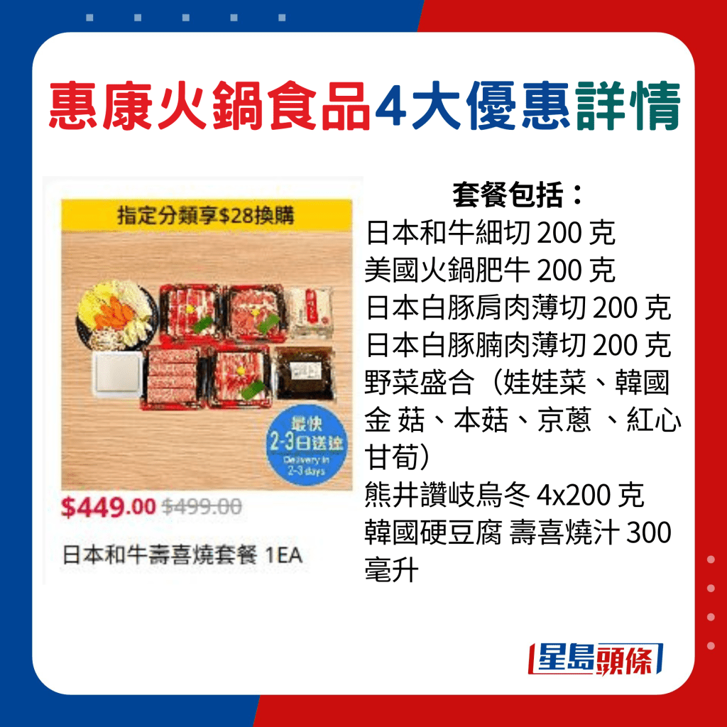 网店限定优惠套餐,包括美国穀饲牛肉寿喜烧套餐/标准价$299、网上限定价$269;日本和牛寿喜烧套餐/标准价$499、网上限定价$449;麻辣鸡煲火锅套餐/标准价$280、网上限定价$199,由即日至11月14日网购满$1,111享额外11%折扣,新客户买满$299免运费。