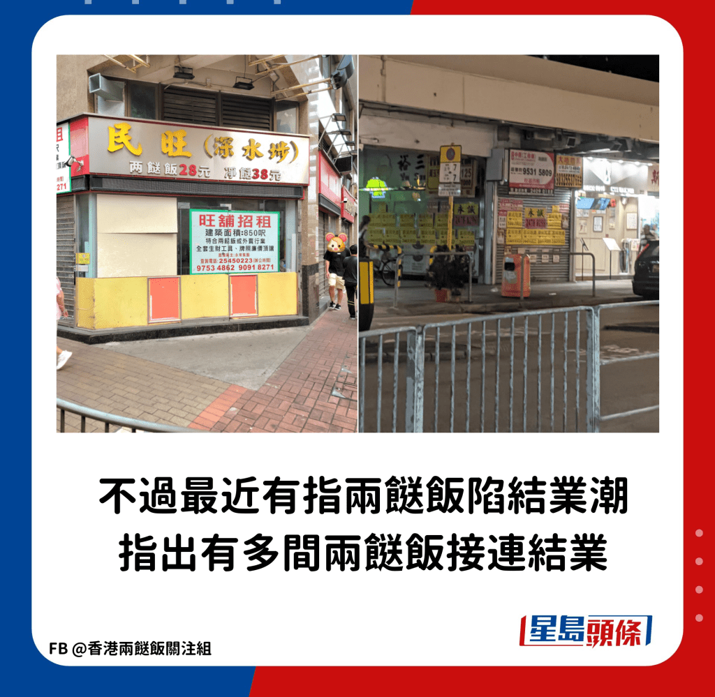 近日有报导指出,多区都有两餸饭店接连结业,包括位于元朗的“裕三和”、位于深水埗的“民旺”、“岱民”小西湾分店以及佐敦的“家之味”,形容连“穷人恩物”都不敌结业潮,引起网民热议,有人表示“做唔住都係因为唔好食。”、“收支不平衡早早结业”、“开始食到厌”、“斗平无用,要好食先得。”更引来Facebook群组“香港两餸饭关注组”版主亦发文回应!