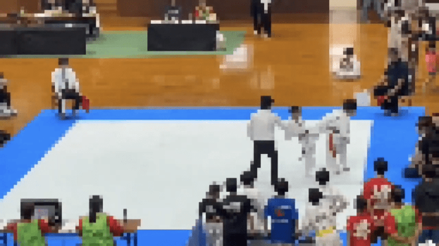 日本神奈川县川崎市一场小学生空手道比赛出现充满争议的一幕。两名小选手在对战中遭裁判喊停,双方准备回到起始位置重新对战时,其中一名选手竟在教练指示下,趁对手转身出脚飞踢其后脑。
