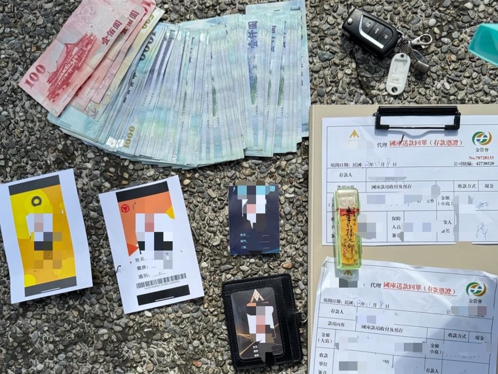 ▲警方在陈姓车手身上查获的现金、假证件、文件等赃证物。民众提供