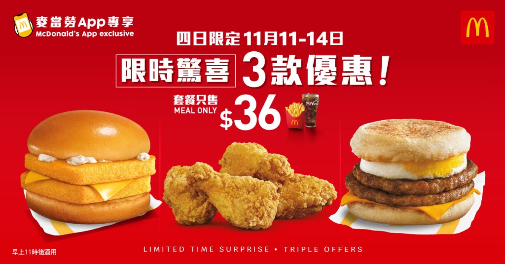 麦当劳App将于11月11日(一)至11月14日(四)推出“晚上6时起指定超值套餐优惠减$5”,而深受欢迎的“$36超值套餐”亦会继续加推,麦当劳App用户独家专享$36双层鱼柳饱套餐、双层猪柳蛋汉堡套餐,以及脆香鸡翼(4件)套餐,让大家以超值价品尝美食。