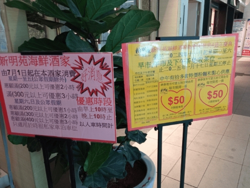 ▲指位于火炭的“新明苑海鲜酒家”贴出“救亡”大字报,推出各种优惠吸引客人