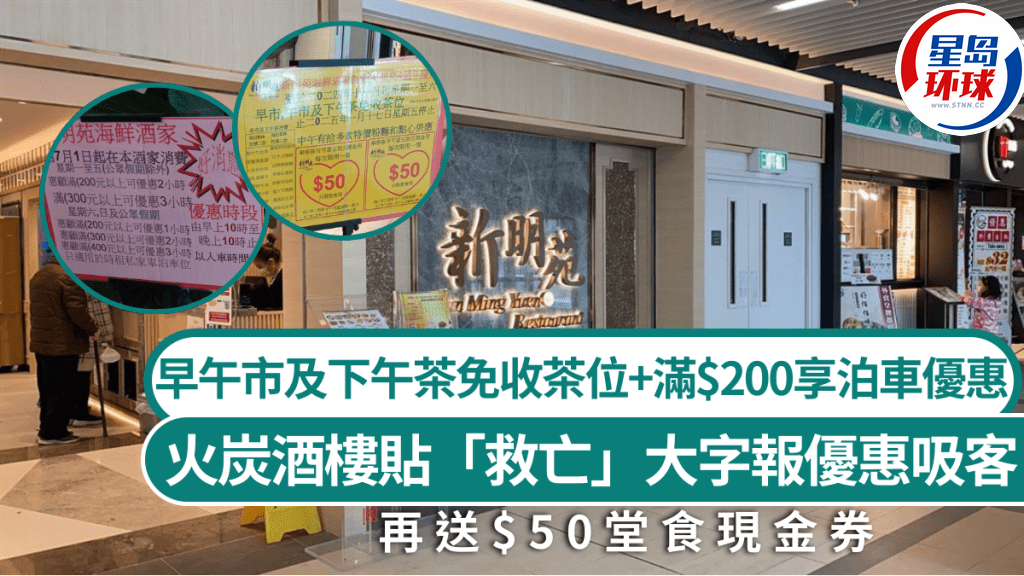 受港人北上热潮影响,香港餐饮业步入寒冬,有酒楼更需贴出“救亡”大字报推优惠吸客!近日,有网民在社交平台分享照片,指位于火炭的“新明苑海鲜酒家”贴出“救亡”大字报,推出各种优惠吸引客人,包括早午市及下午茶免收茶位、惠顾满$200可享泊车优惠,以及免费送$50堂食现金券!