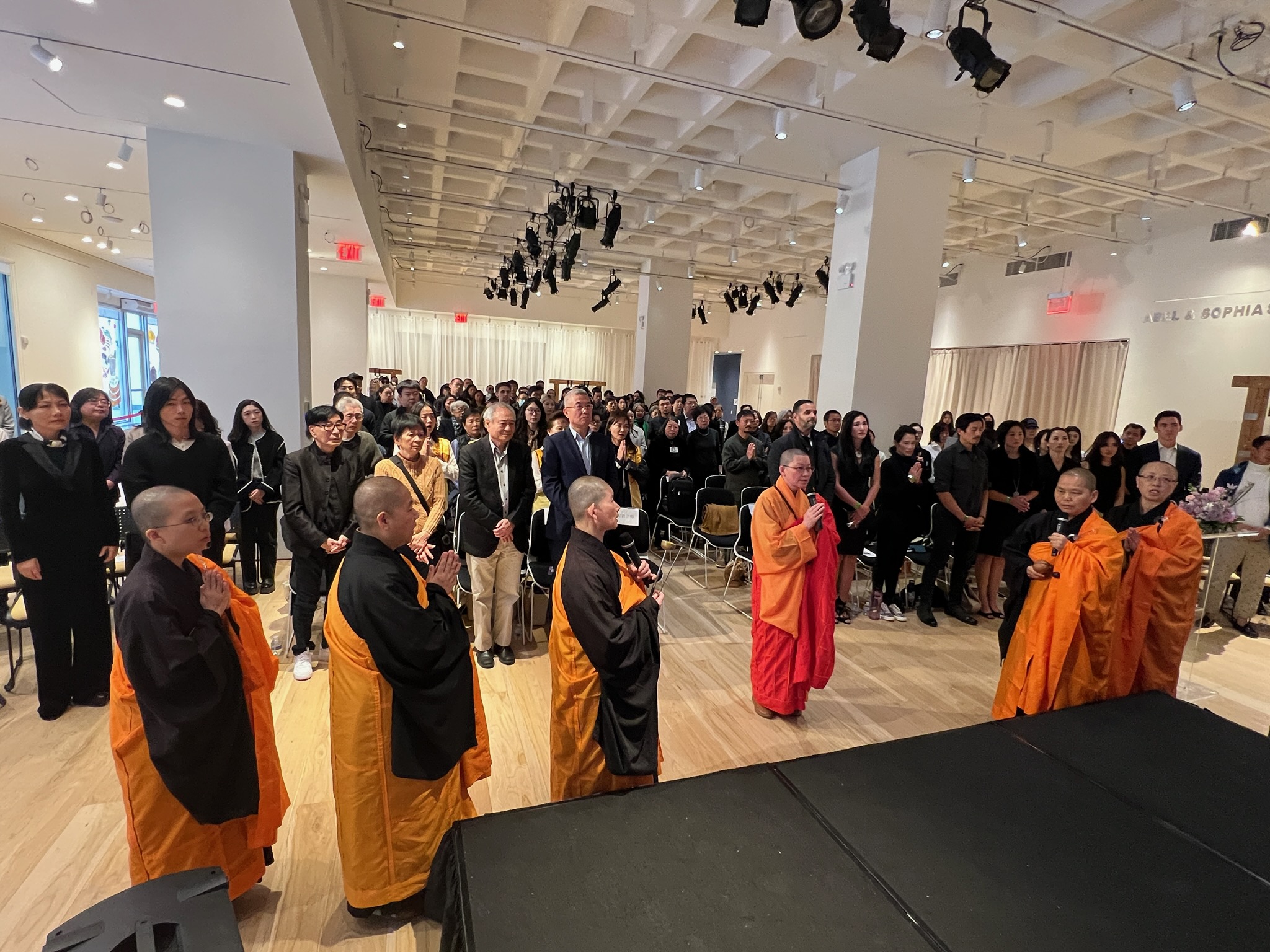 开场白后,佛光山纽约道场释有霖法师带领大众祈福,并表示,郑佩佩1992年皈依佛教,追随星云法师,星云为她起了一个“普方”的法名,以她专业弘扬佛法,普及四方。