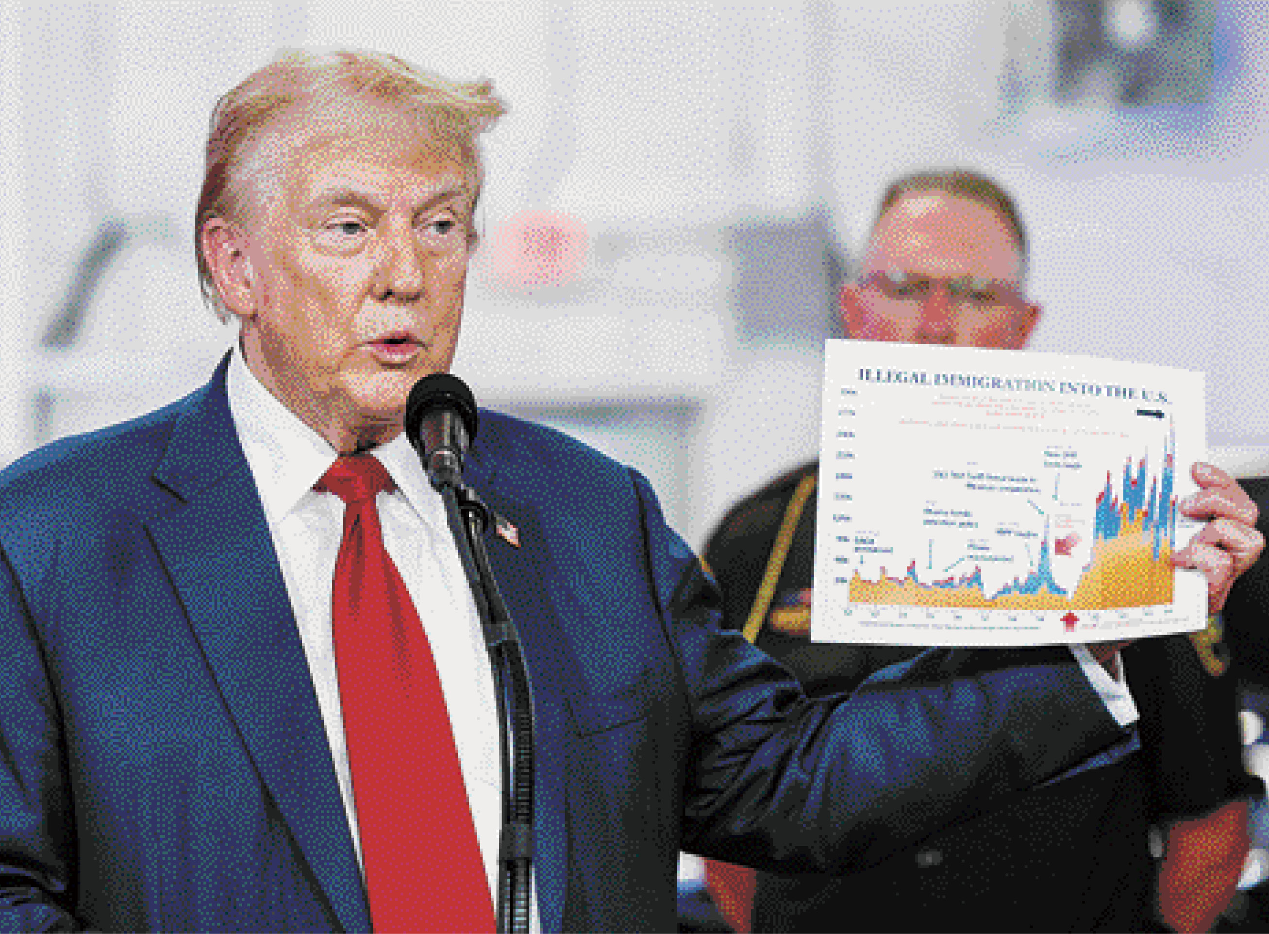 ▲候任总统特朗普宣称明年接任后的首要任务之一就是解决非法移民问题。图为他访问密歇根州豪厄尔市利文斯顿县治安官办公室时,手拿一张有关非法移民美国的图表。 路透社资料图片