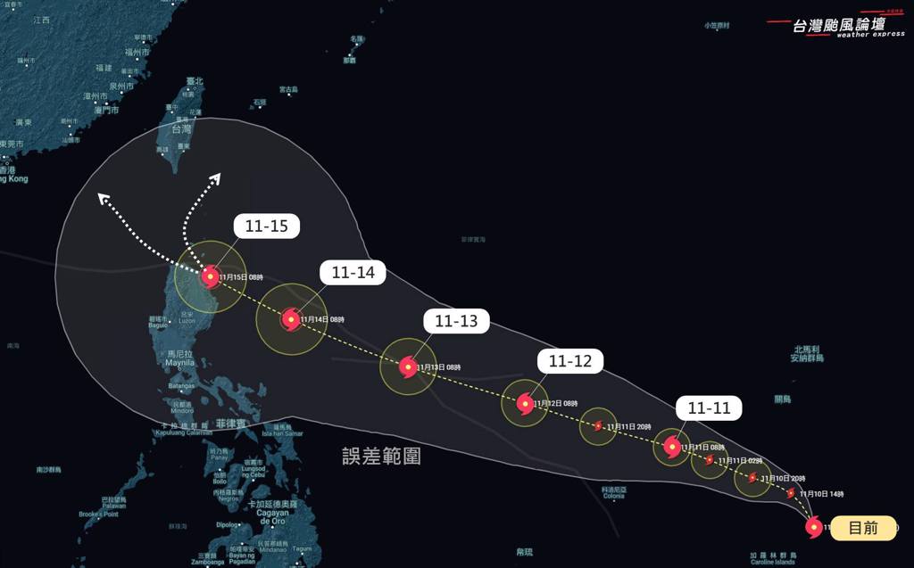 ▲未来天兔台风接近吕宋岛时,可能北转往台湾东方前进。(翻摄自 台湾台风论坛|天气特急脸书)