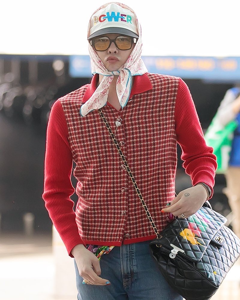 G-Dragon上周旋风式赴港出席Chanel时装秀,机场Look以品牌的红色千鸟格纹针织外套下配牛仔裤,并以印花丝巾当作头巾,更披在Cap帽以外。 他在翌日出席时装秀,就以粉红色花呢外套配碎花波浪褶衬衫。