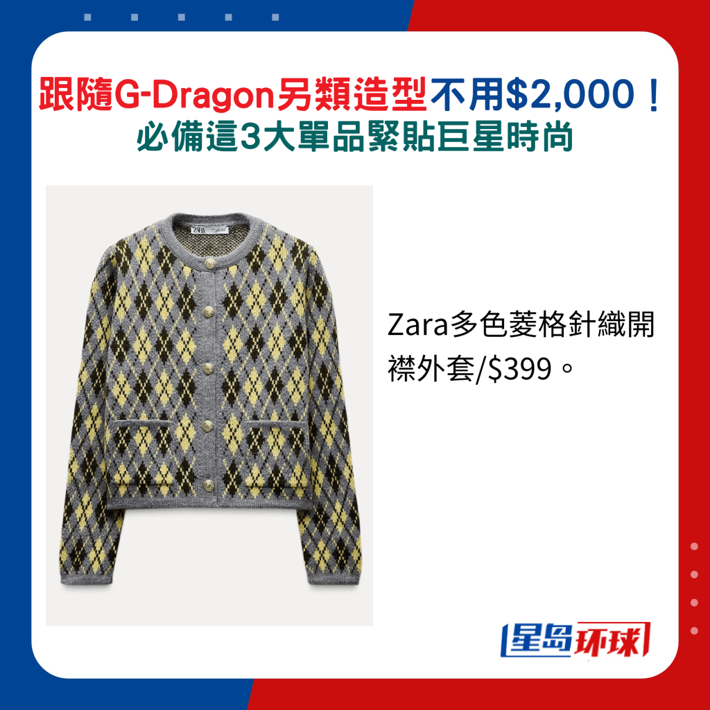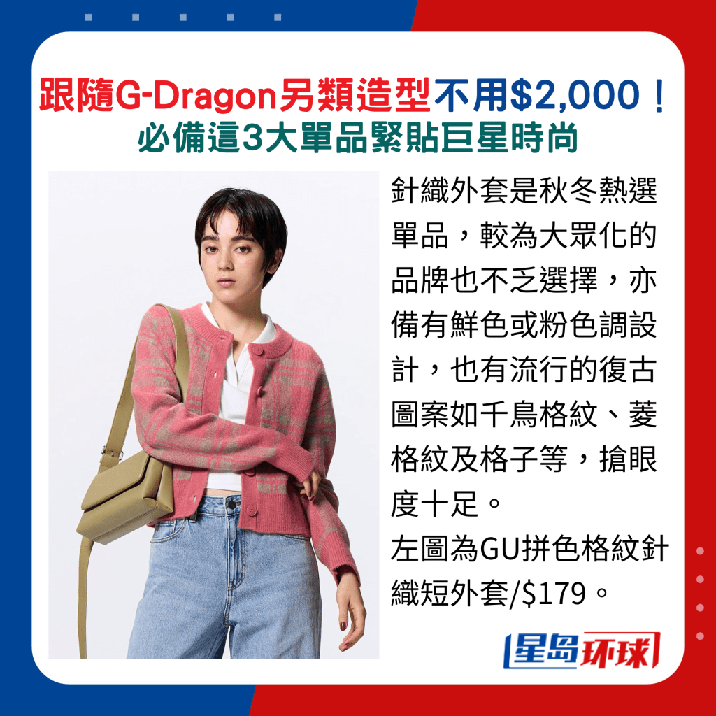针织外套是秋冬热选单品,较为大众化的品牌也不乏选择,亦备有鲜色或粉色调设计,也有流行的复古图案如千鸟格纹、菱格纹及格子等,抢眼度十足。 想平衬GD造型,首推GU的粉红拼灰色格纹外套,选配粉红色钮扣,休闲随性。 另Zara的全新外套款式以黄、深啡及灰色为主,配搭怀旧菱形图案及金色钮扣,同样典雅。 至于花呢外套大可选择缀以闪线、珠饰亮片及金属钮扣的款式,拉近相似度,如Love, Bonito新推的深浅象牙白色短身设计,便是简约又贵气之选。