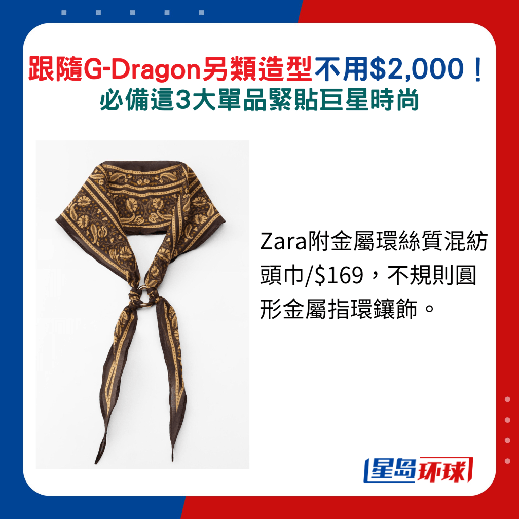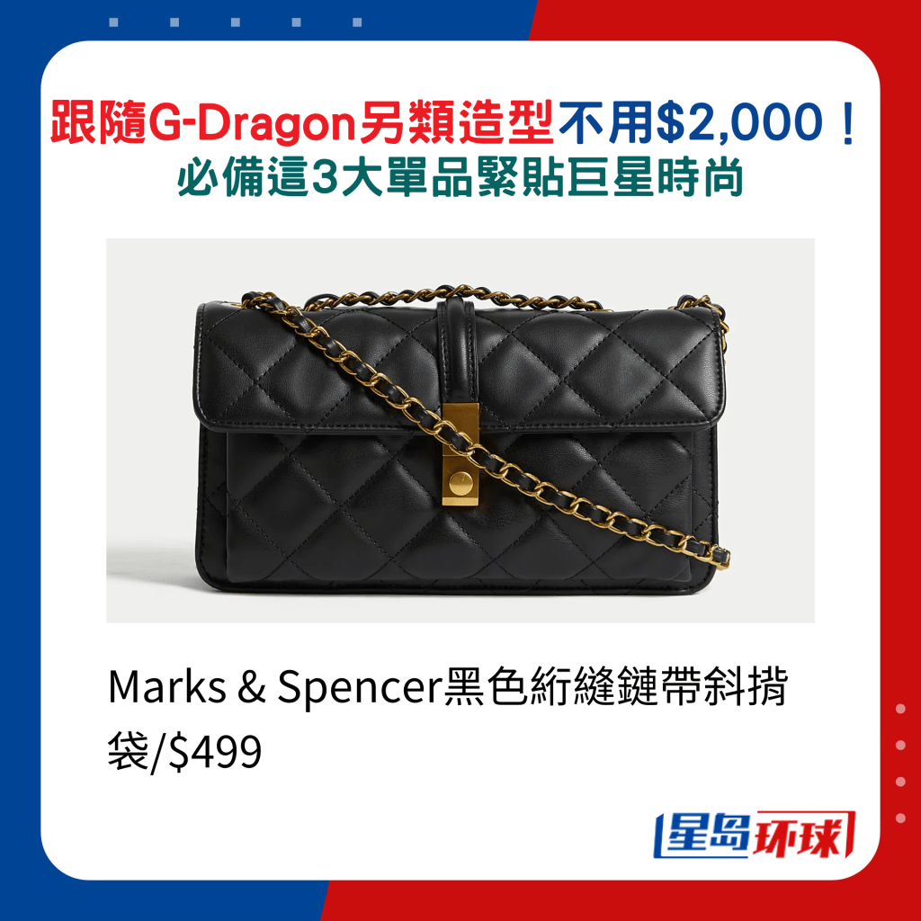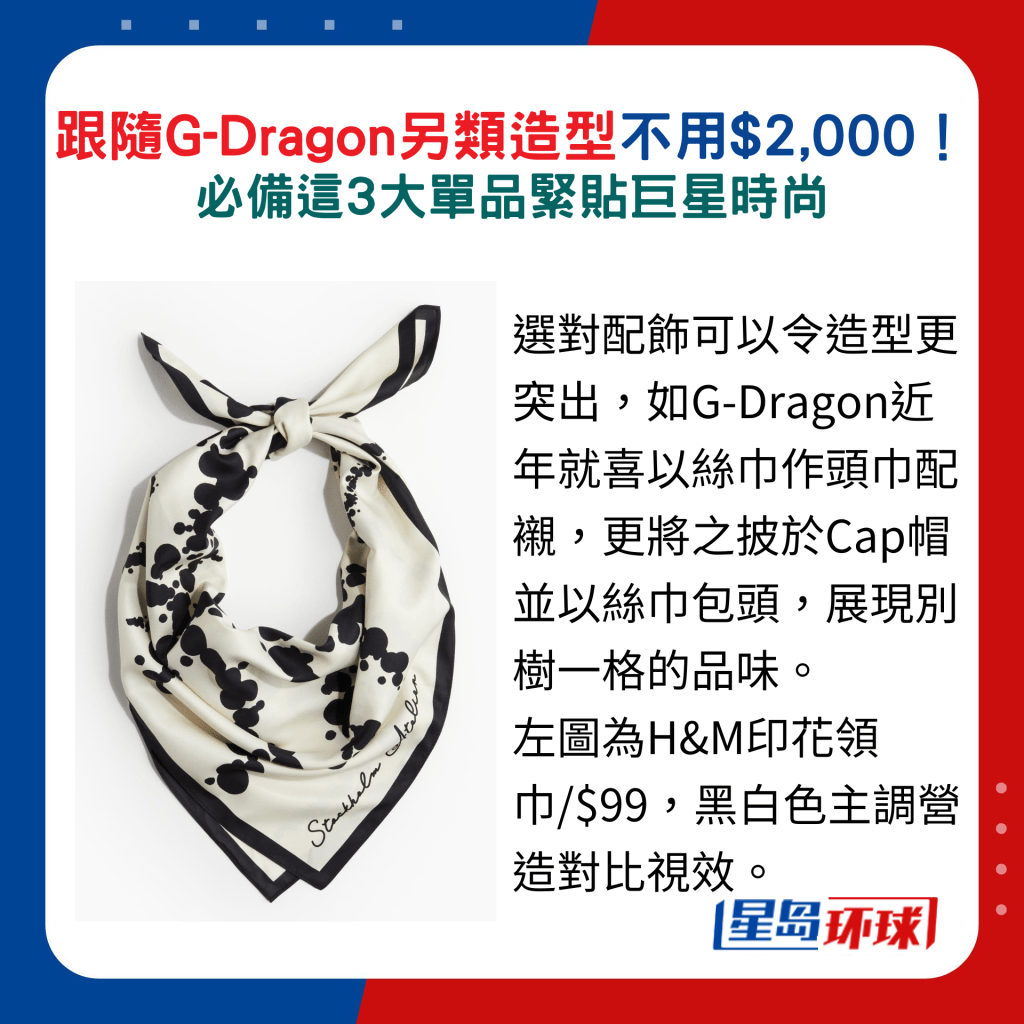 选对配饰可以令造型更突出,如G-Dragon近年就喜以丝巾作头巾配衬,更将之披于Cap帽并以丝巾包头,展现别树一格的品味。 同样地,大众化价钱都有选择,如快速时尚品牌H&M及Zara,前者的黑白色印花图案丝巾,兼备头饰与肩饰,后者的头巾则配以金属环装饰,方便灵活配搭。 除了以上之外,想找售价亲民的Chain Bag,Charles & Keith新登场的Apfra黑色菱格纹手袋包罗大型号及手挽款式,可迎合不同造型穿搭及场合需要。