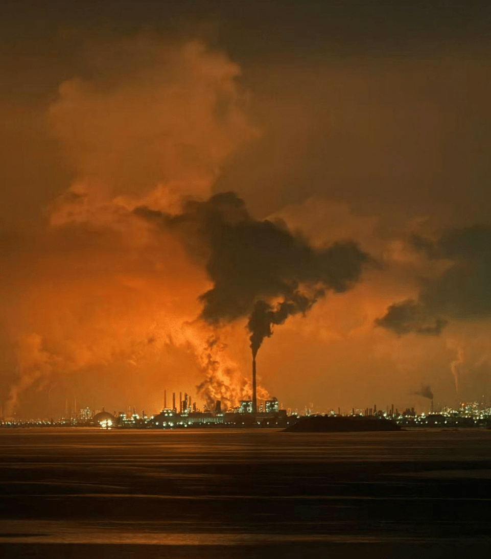 ▲其中一张背景疑似一座发电厂发生火警,烈燄熊熊,天空一片橙红色。