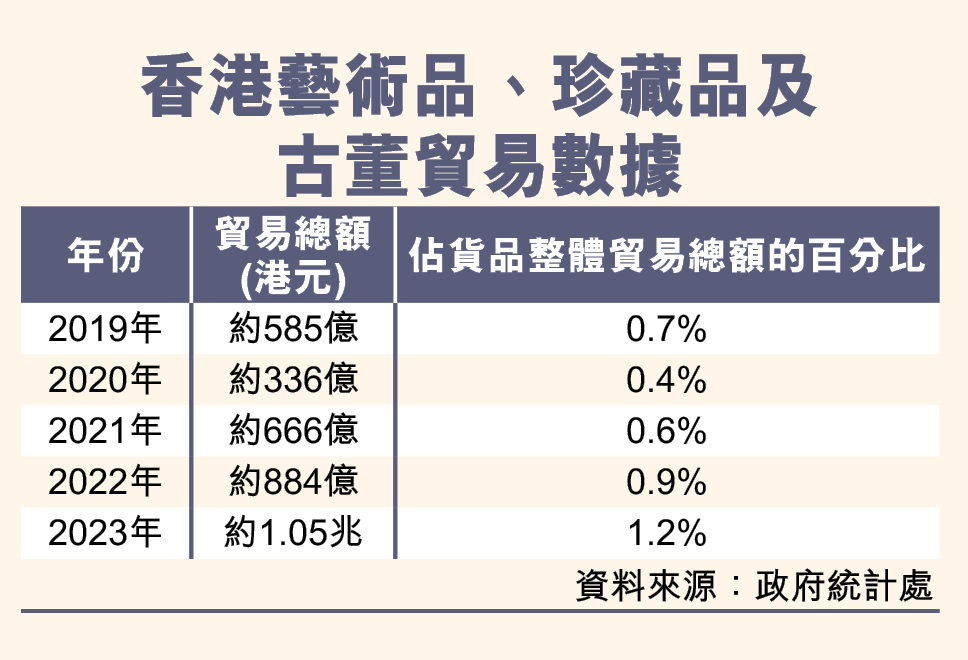 香港艺术品交易市场一直蓬勃发展,参考政府统计处数据,过去5年,香港艺术品、珍藏品及古董每年贸易总额,介乎约336亿至1.055兆港元不等,成绩骄人(见表)。