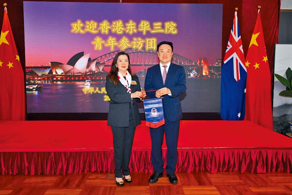 学生大使参访团拜访中国驻悉尼总领事馆,邓明慧主席在会面中感谢于杰代总领事及各位领导接待,强调是次访问为学生们提供了宝贵的学习机会。邓主席指出:“这是东华三院首次组织学生大使前往澳大利亚,期望同学们在行程中展现主动和自信,珍惜此难得的学习机会。”
