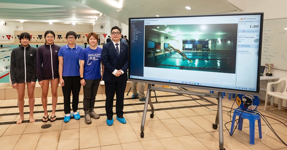 ▲理大康复治疗科学系助理教授苏俊龙(右)与团队为拔萃女书院泳队进行姿势研究和分析。 理大图片
