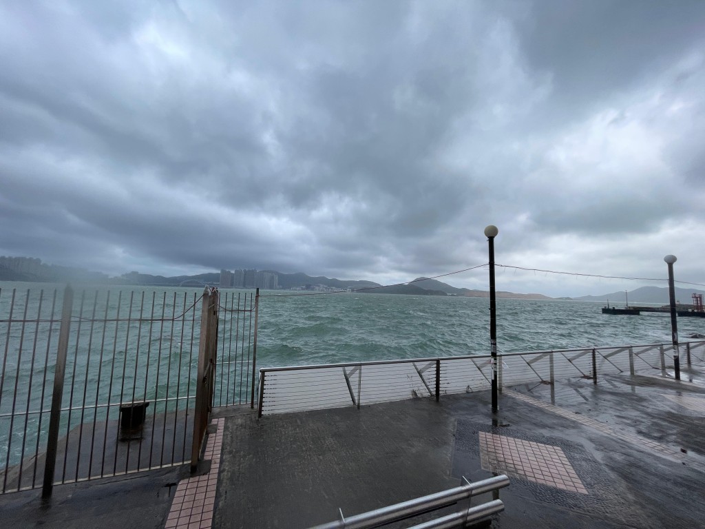 ▲清晨岸边人流稀少,但仍有零星市民冒着八号风球晨运。