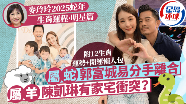 【麦玲玲蛇年生肖运程】2025蛇年生肖运程,麦玲玲师傅为大家分享吉星凶星开运贴士!除了要留意自己的生肖有否犯太岁,或是犯哪一种太岁外,亦要留意今年的吉星及凶星。《星岛》集合麦玲玲师傅2025蛇年运程分析,看看哪些艺人明星新一年行好运?又有哪位犯太岁?并附上12生肖蛇年开运锦囊。即睇麦玲玲2025蛇年生肖运程上集,包括属蛇、属马、属羊、属猴、属鸡及属狗的明星艺人及名人运程及各12生肖开运方法。