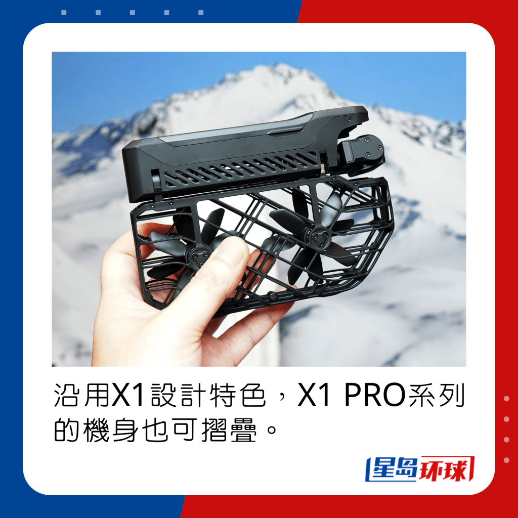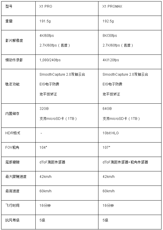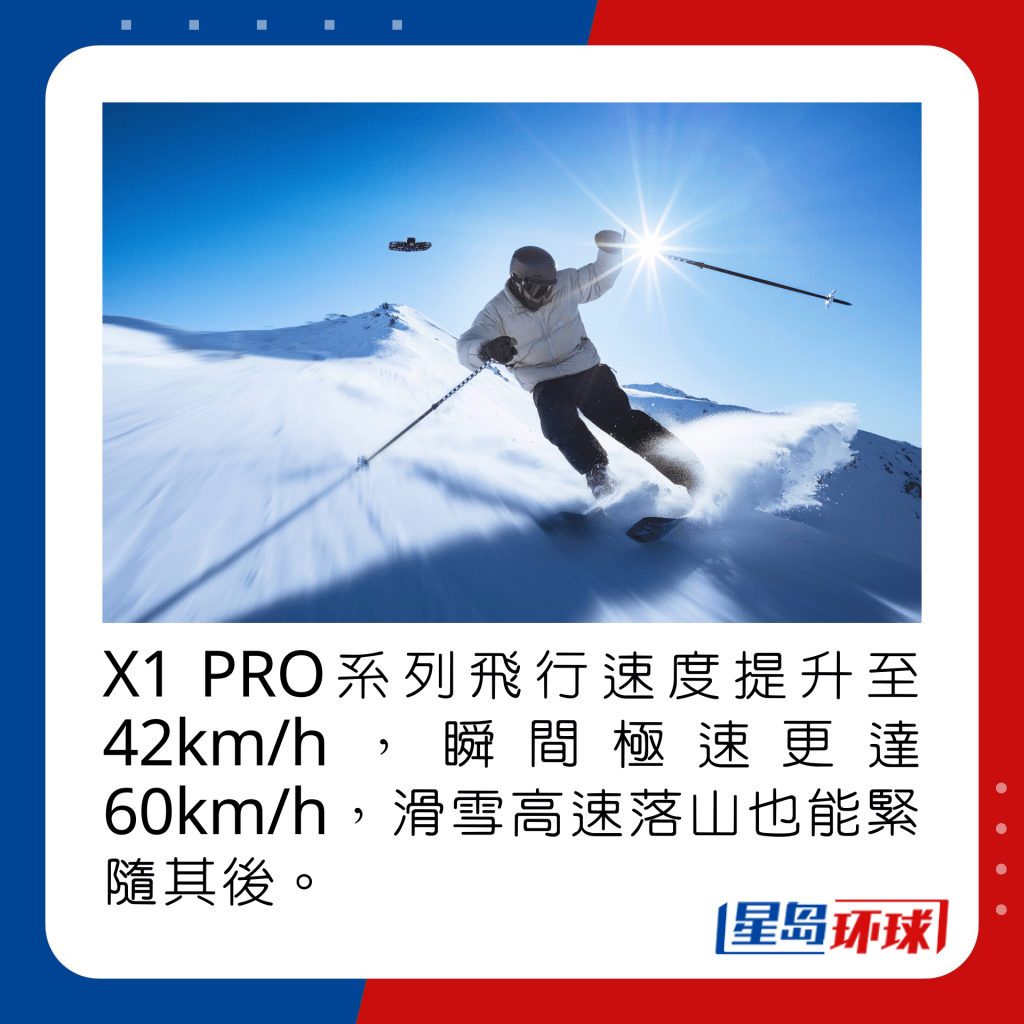 X1系列不错颇受单车友欢迎,不过由于飞行速度最快仅24km/h,单车友踩得太快有时候会跟不上。 有见及此,X1 PRO系列飞行时提速至42km/h,瞬间最高速度可达60km/h,公路踩单车也好,滑雪也好,2款新作都可高速跟随用家,确保捕捉到精彩时刻。 飞得快之余,X1 PRO系列亦飞得更稳更高,抗风能力由4级提升至5级,飞行高度大幅攀升至120米,续航时间亦由11.5分钟延长至16分钟,配合便携式智能充电盒,续航可延长至56分钟。