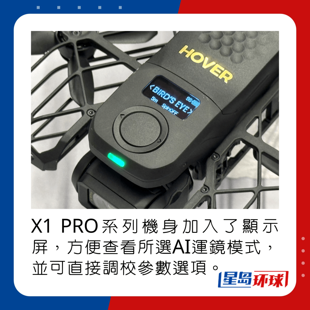 X1 PRO系列随跟自拍时,往住需要向后飞行,故退后避障非常重要,今代飞行器尾部均装有dToF测距传感器,X1 PROMAX更多了视角传感器,退后飞行时主动避障能力更出色,必要时还可来个急煞。 一如X1系列那样简单易用,X1 PRO系列不用遥控或手机App,直接放在手掌上,即可以升降,为方便初学者,还预设多种AI智能运镜模式,包括跟随、环绕、俯拍、渐远等等,加上X1 PRO系列新增显示屏,选择模式更方便,且可直接调校高度及距离等参数。