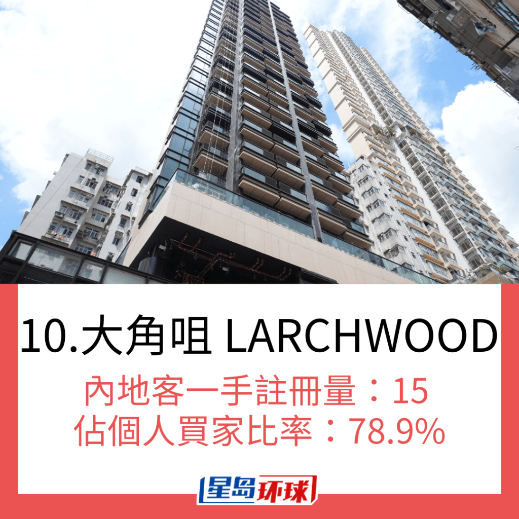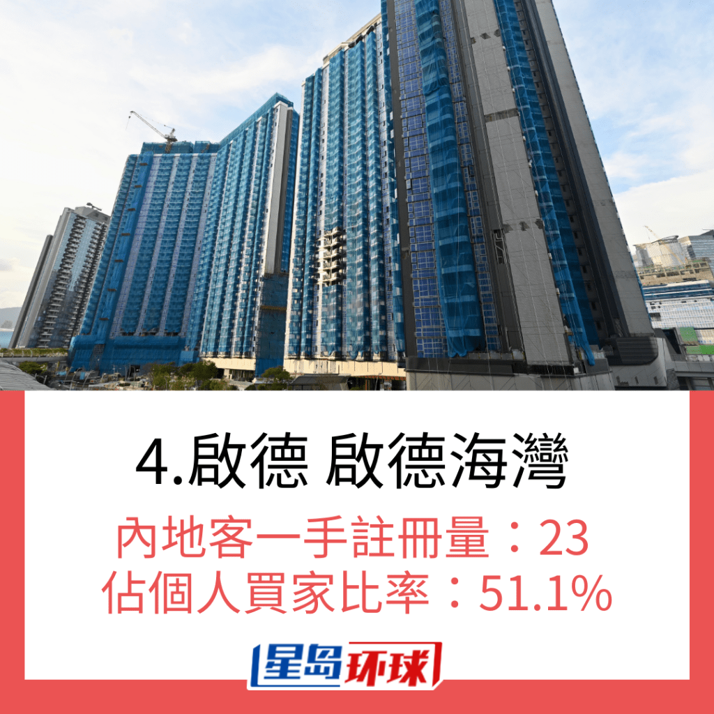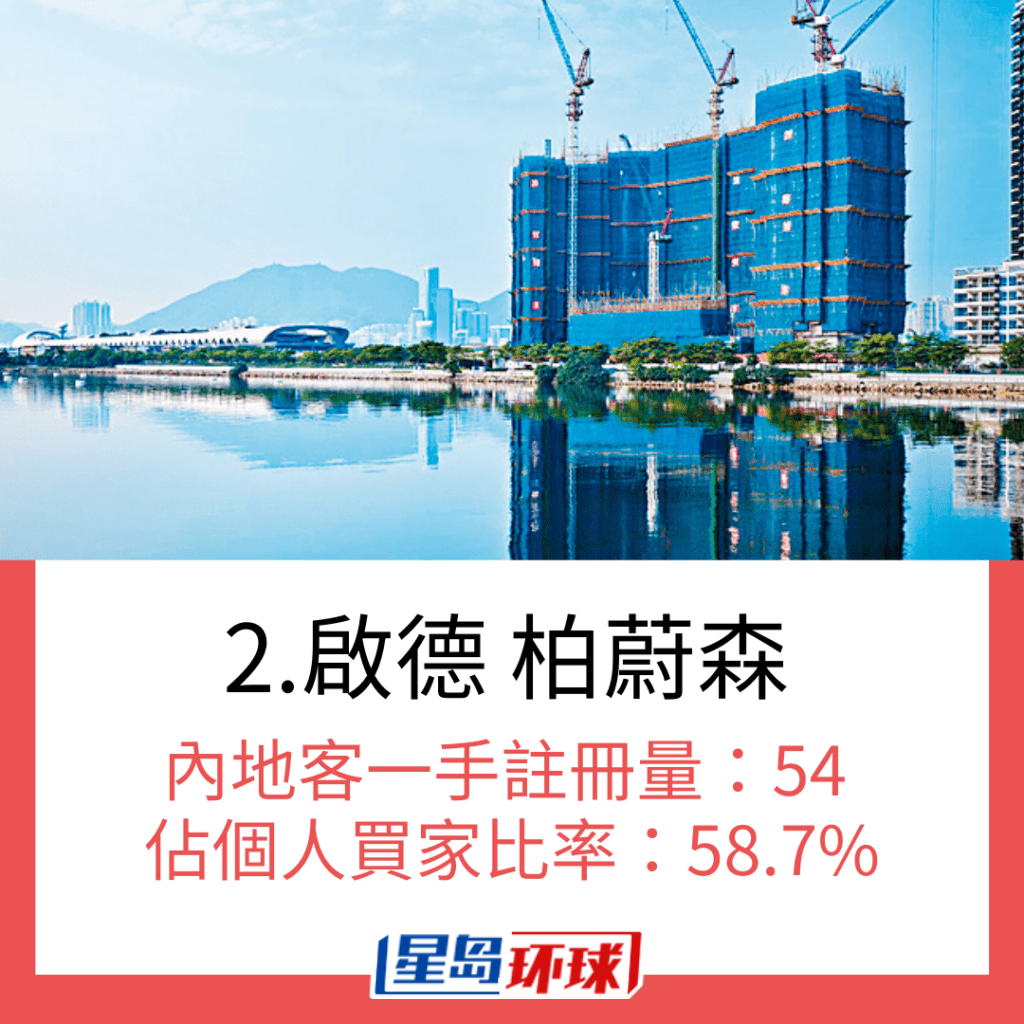 若以10月一手私宅注册量最多内地买家的首10个新盘计算,当中最多内地买家选购的新盘是启德天玺. 天,月内录119宗注册登记,占该项目的个人买家约45.6%。 内地买家选购第二多的新盘是同样位处启德区的柏蔚森,月内录54宗内地买家注册登记,占比更达58.7%。 若以占比计算,北角海璇的内地买家一手私宅注册量占比高达80.8%; 大角咀LARCHWOOD亦占约78.9%。