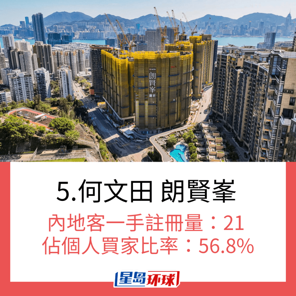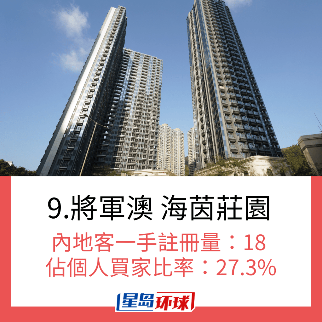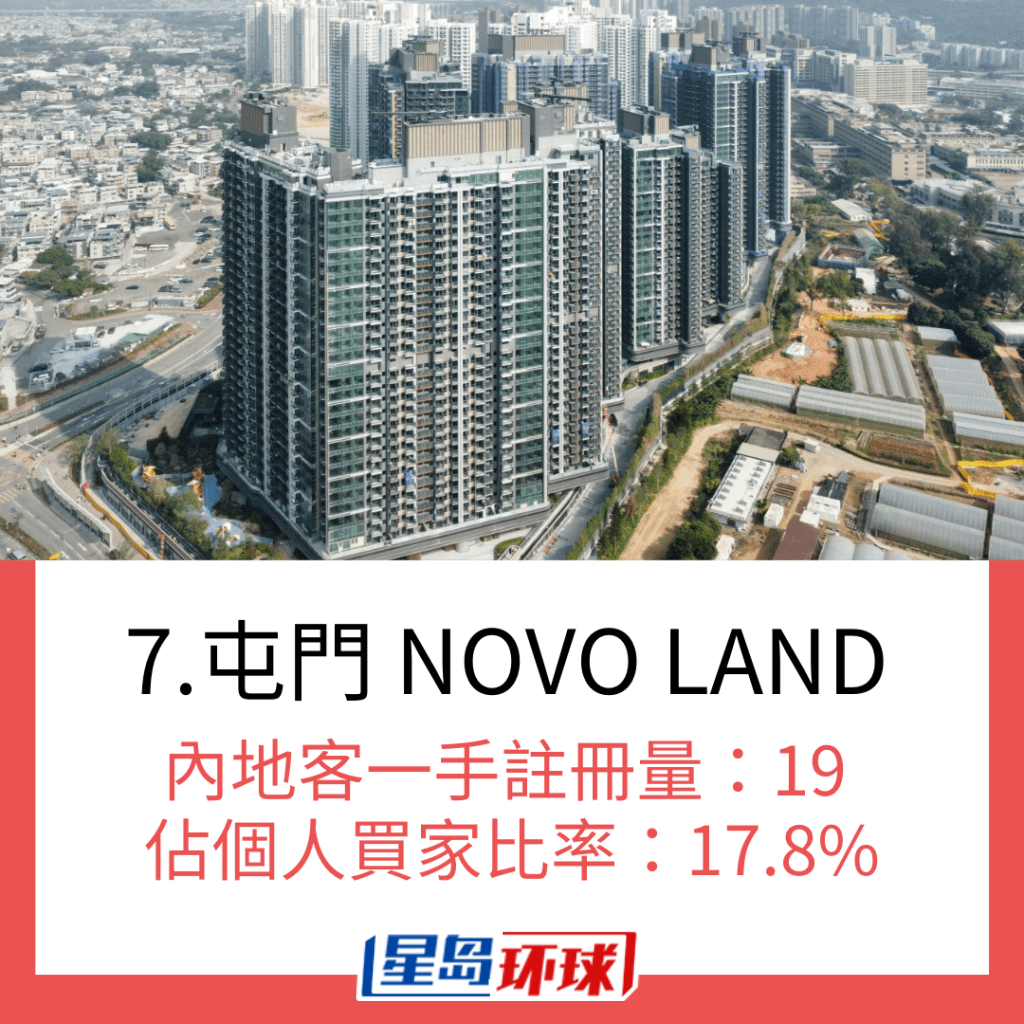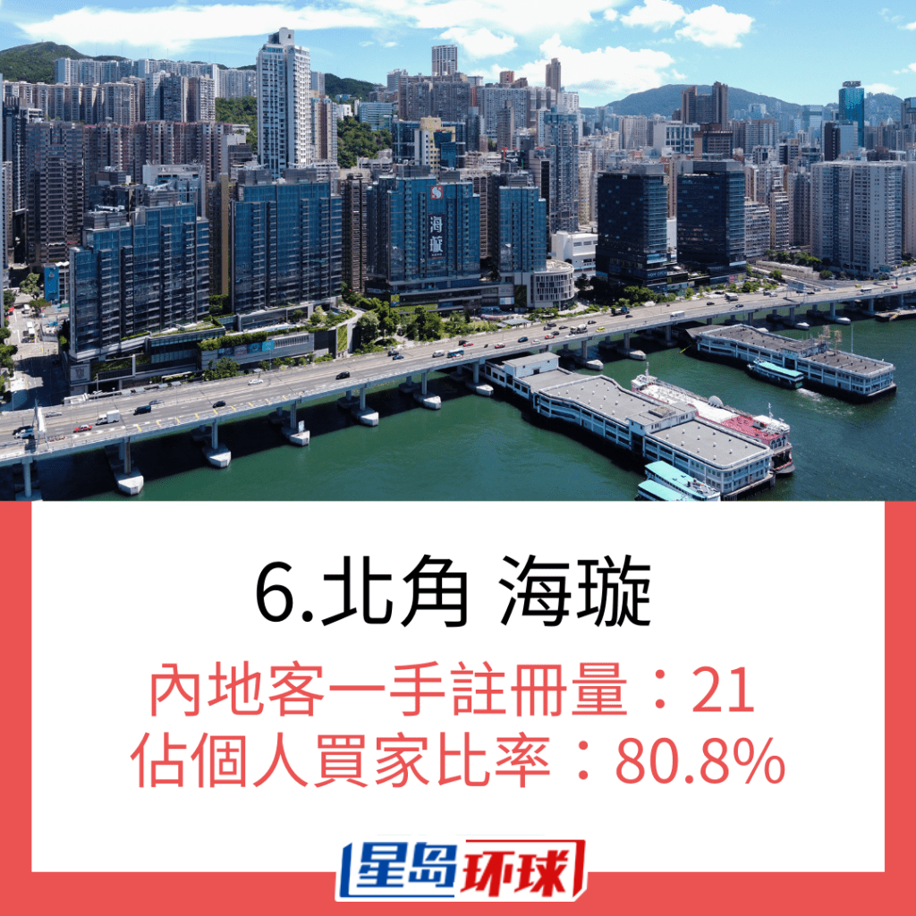 若以10月一手私宅注册量最多内地买家的首10个新盘计算,当中最多内地买家选购的新盘是启德天玺. 天,月内录119宗注册登记,占该项目的个人买家约45.6%。 内地买家选购第二多的新盘是同样位处启德区的柏蔚森,月内录54宗内地买家注册登记,占比更达58.7%。 若以占比计算,北角海璇的内地买家一手私宅注册量占比高达80.8%; 大角咀LARCHWOOD亦占约78.9%。