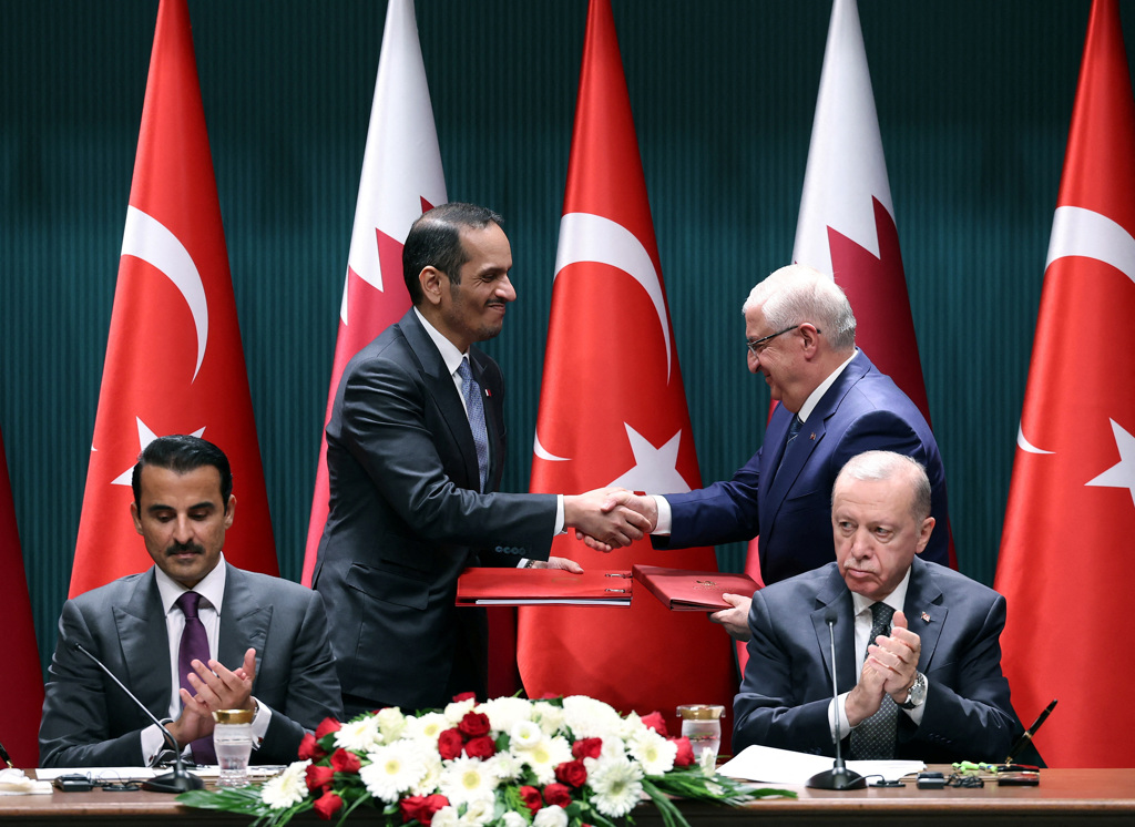 ▲2024年11月14日,土耳其总统埃尔多安和卡塔尔国王塔米姆于 在土耳其安卡拉总统府出席签字仪式。(路透社)