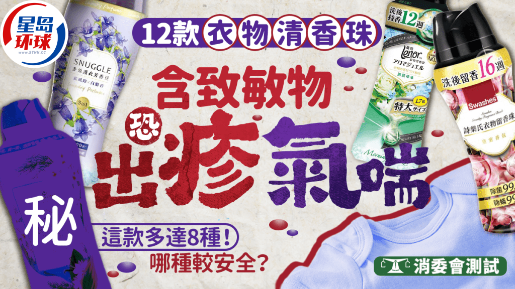 消费者委员会11月15日发表衣物清香珠检测结果,测试市面12款衣物清香珠样本,包括熊宝贝、柔丽(Softlan)、兰诺(Lenor)、纺优美(ar Füm)等品牌,结果全部均检出不同种类和浓度的香料致敏物质,最多1款更检出共8种!另有4款样本检出不易被生物降解的人造麝香化合物佳乐麝香,长远或对海洋生态造成影响。到底哪款较安全?