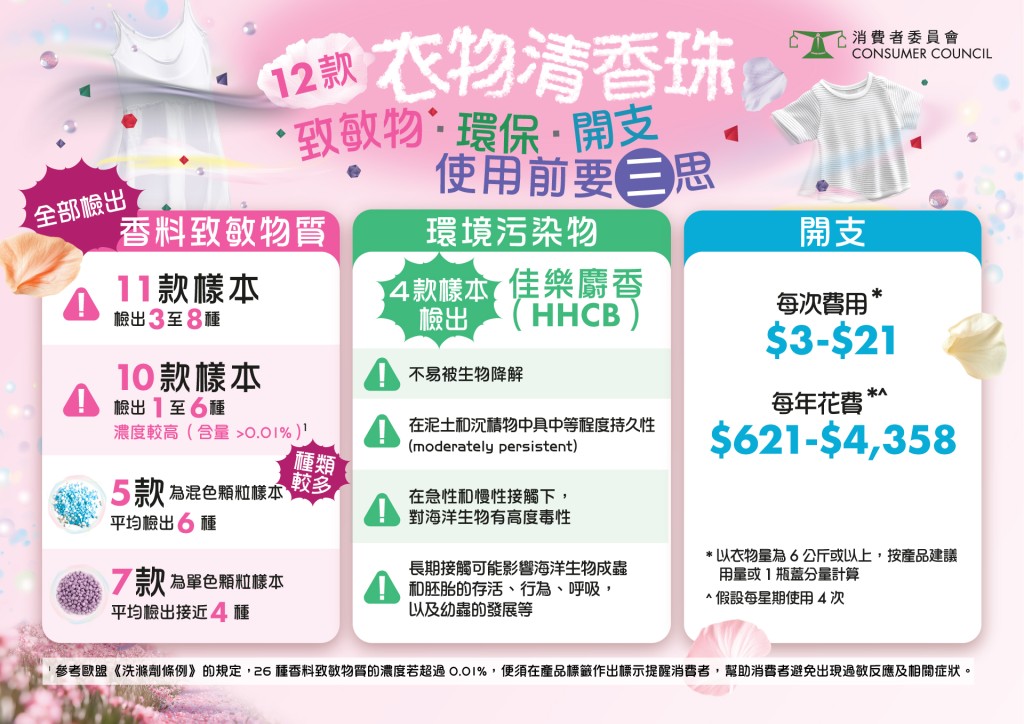 消委会引述美国接触性皮肤学会的报告指,衣物护理用品是引致过敏性接触性皮肤炎的重要原因。这次测试结果显示,全部12款衣物清香珠样本均检出香料致敏物质,总量由0.0023%至0.672%不等,除只有1款含1种香料致敏物质外,其余11款同时检出3种至8种。检测亦发现,含有不同颜色清香珠颗粒的样本所检出的种类普遍较多,双色样本平均检出6种,而单色颗粒样本则平均检出接近4种。