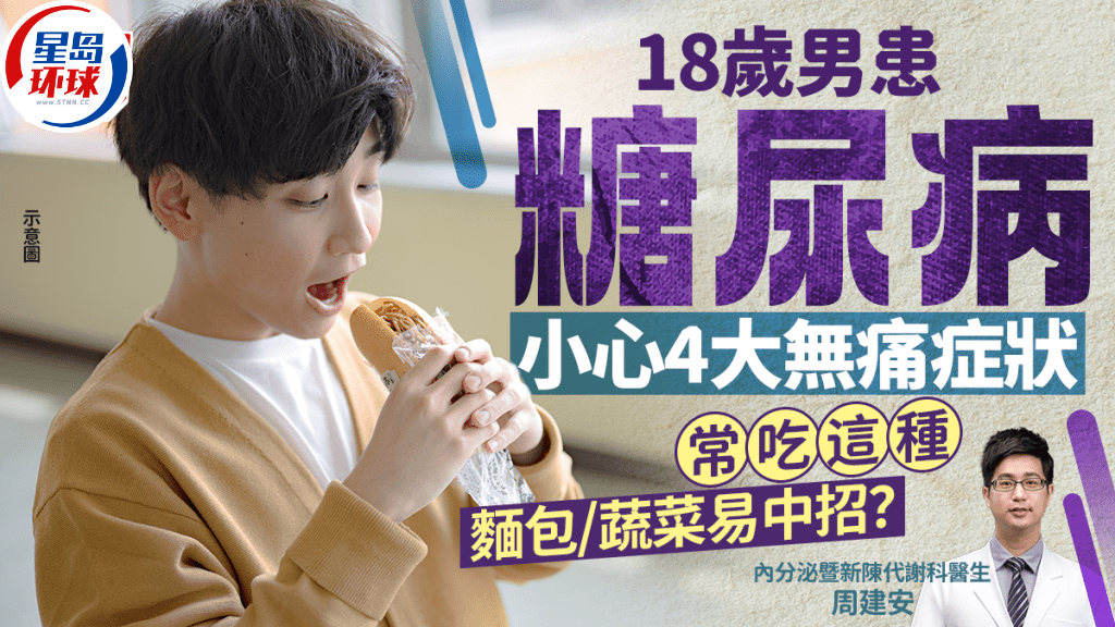 年轻人也可能患糖尿病!有医生分享病例指,一名年仅18岁的男子确诊糖尿病,其中有4大无痛症状最易忽略。有11种饮食习惯易增风险,常吃1种面包、蔬菜也可能中招?