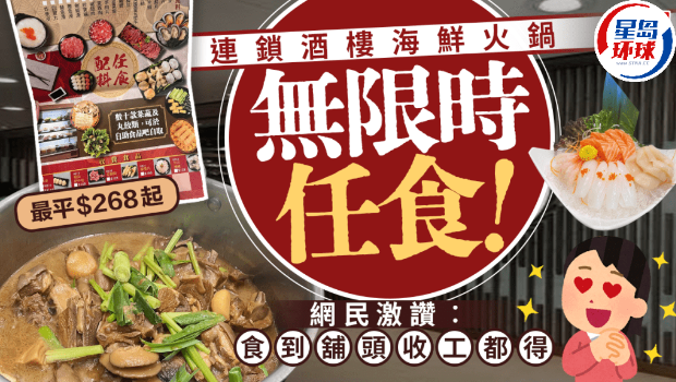 秋风起,吃货族大叹煲仔饭、腊味饭及蛇羹之外,还有火锅! 在香港打边炉,火锅选择既有日式海鲜火锅放题,也有主打潮汕牛肉的火锅,以及1人火锅等多元化种类。 最近有网民在社交平台分享光顾一间连锁酒楼的海鲜火锅放题,大赞“超级抵食”、“包埋饮品同啤酒任饮”,再加上“无限时”关系,直言:“由5:00食到收工都仲得”。