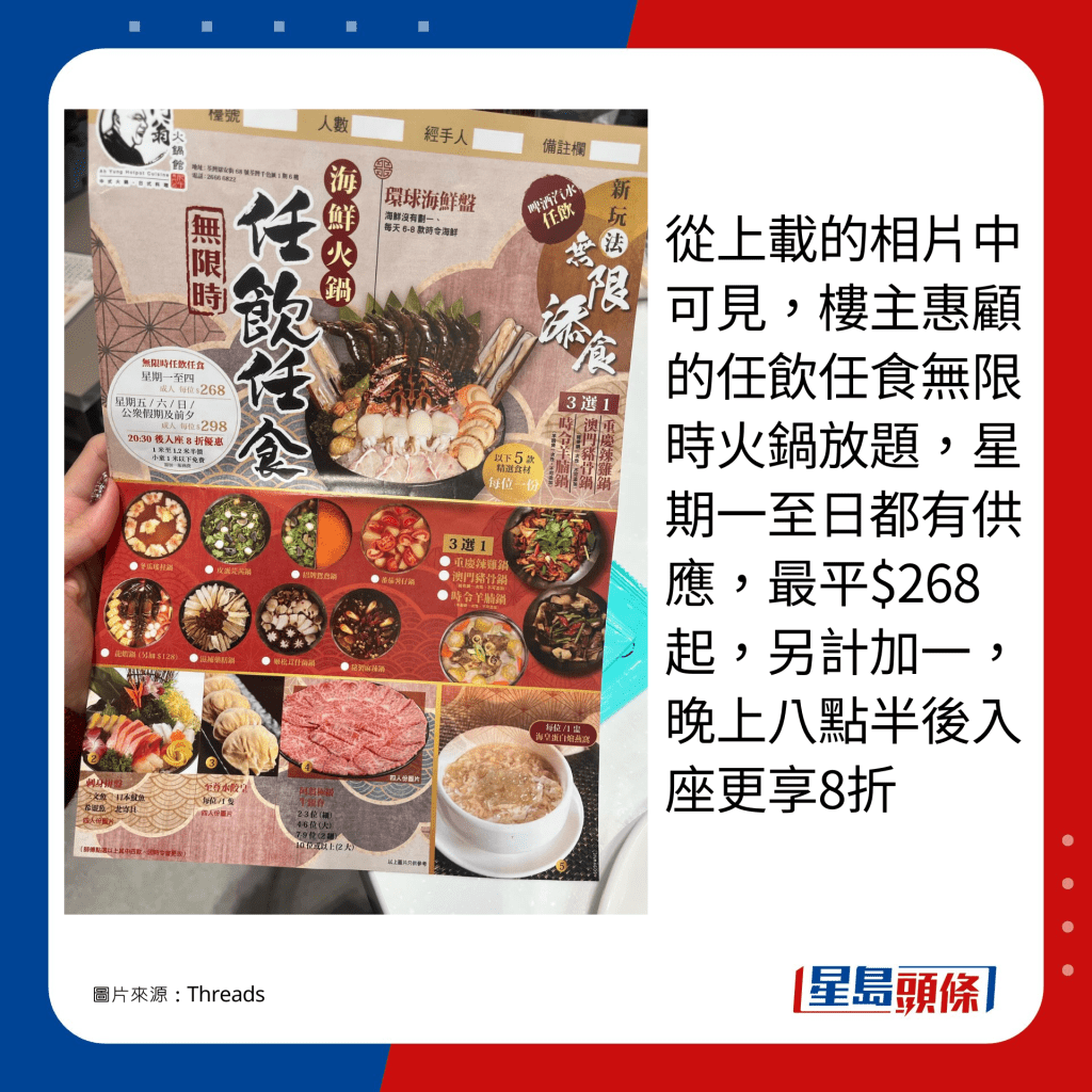 该位网民在Threads发帖,图文并茂,跟网民分享是次在连锁酒楼惠顾火锅放题的愉快体验。 文中甫开首道:“唔知道大家有冇食过,超级抵食”,接着楼主便指出,因为无限时的关系,可以“由5:00食收工都仲得”,而饮品及啤酒任饮之外,兼且“头盘会送5样野”。 从上载的相片中可见,楼主惠顾的任饮任食无限时火锅放题,星期一至日都有供应,最平$268起,逾数十款丸类及蔬菜任食,更可获赠刺身拼盘、水饺皇、牛颈脊及蛋白烩燕窝,惟要留意上述的4款食物会因时令作出更改。