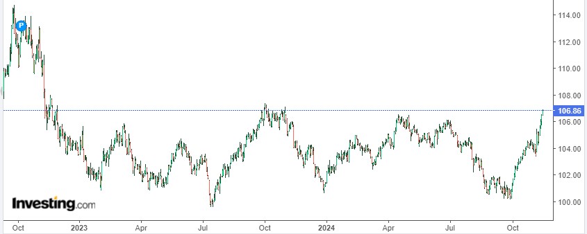 美国10月通胀符预期,令联储局12月减息机会回升,但特朗普再度入主白宫后,外界忧虑其减税及加大关税等政策会推升通胀,从而减慢美国减息步伐,刺激美汇指数连续5日上升,截至周四晚上9时半,一度升至触及107,创去年10月底以来最高,较11月5日美国总统大选日以来累升3.5%。在美元走强下,金、银、铜及多隻非美货币齐齐受压。不过,有外汇专家分析指美汇指数在107水平有阻力,要提防出现逆转情况。