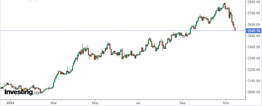 现货金价10月31日曾升至2,790.1美元历史高位,但在特朗普当选、美元急升下,短短两周已回落约8%,坊间有评论担忧在特朗普主政下,联储局放慢减息步伐,加上若他能够结束俄乌战争,化解环球地缘局势风险,或令金价回落。