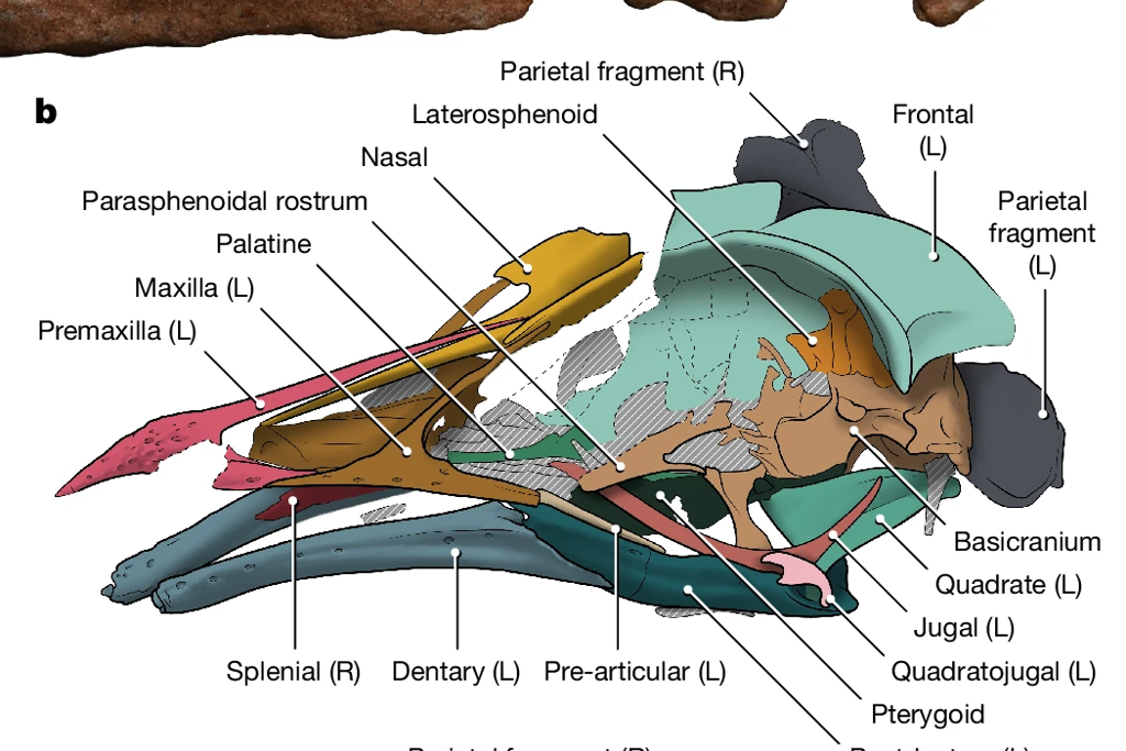 过去缺乏形状保存良好的中生代(Mesozoic)鸟类化石,让研究现代鸟类独特头骨与大脑的起源变得困难。近期,科学家在巴西发现了一种新鸟类化石“Navaornis hestiae”(尚无中文译名),其头骨保存完整且没有牙齿、眼睛大、头颅高耸,与现代鸟类非常相似。这组化石填补了从始祖鸟(Archaeopteryx)到接近现代鸟类之间长达6000万年的空白期,有助于了解现代鸟类特徵形成的过程与时间点。